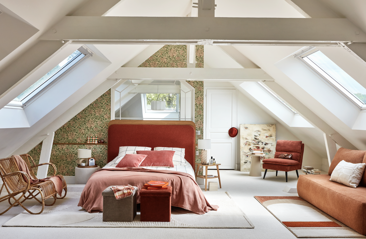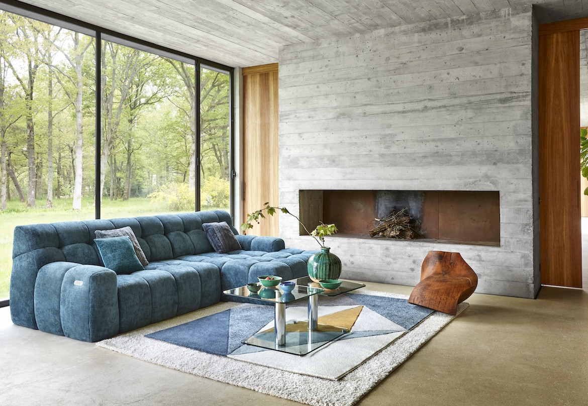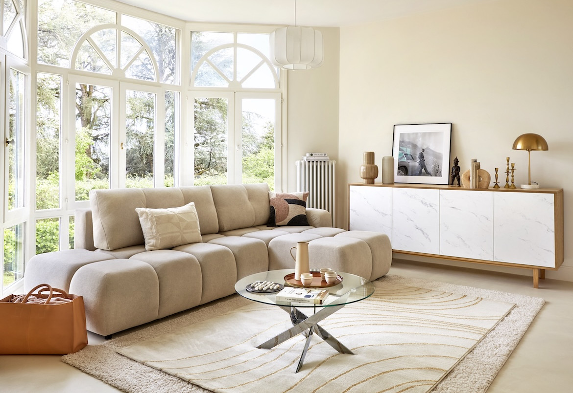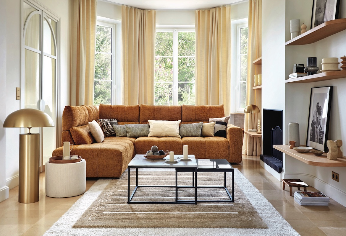 Inspirée des matières brutes, la tendance brutaliste s’impose comme l’une des plus fortes de l’année. Le bois, le béton et les formes massives y côtoient la douceur des textiles. Loin d’être austère, cet univers crée un dialogue subtil entre puissance et sérénité. Le canapé d’angle relax Cocoon, les lignes sculpturales du lit-coffre Japp et le fauteuil Fleura viennent adoucir l’ensemble, tandis que le tapis Betty apporte une note de confort. Une ambiance idéale pour les amateurs d’intérieurs graphiques, où la structure et la texture deviennent des éléments décoratifs à part entière.