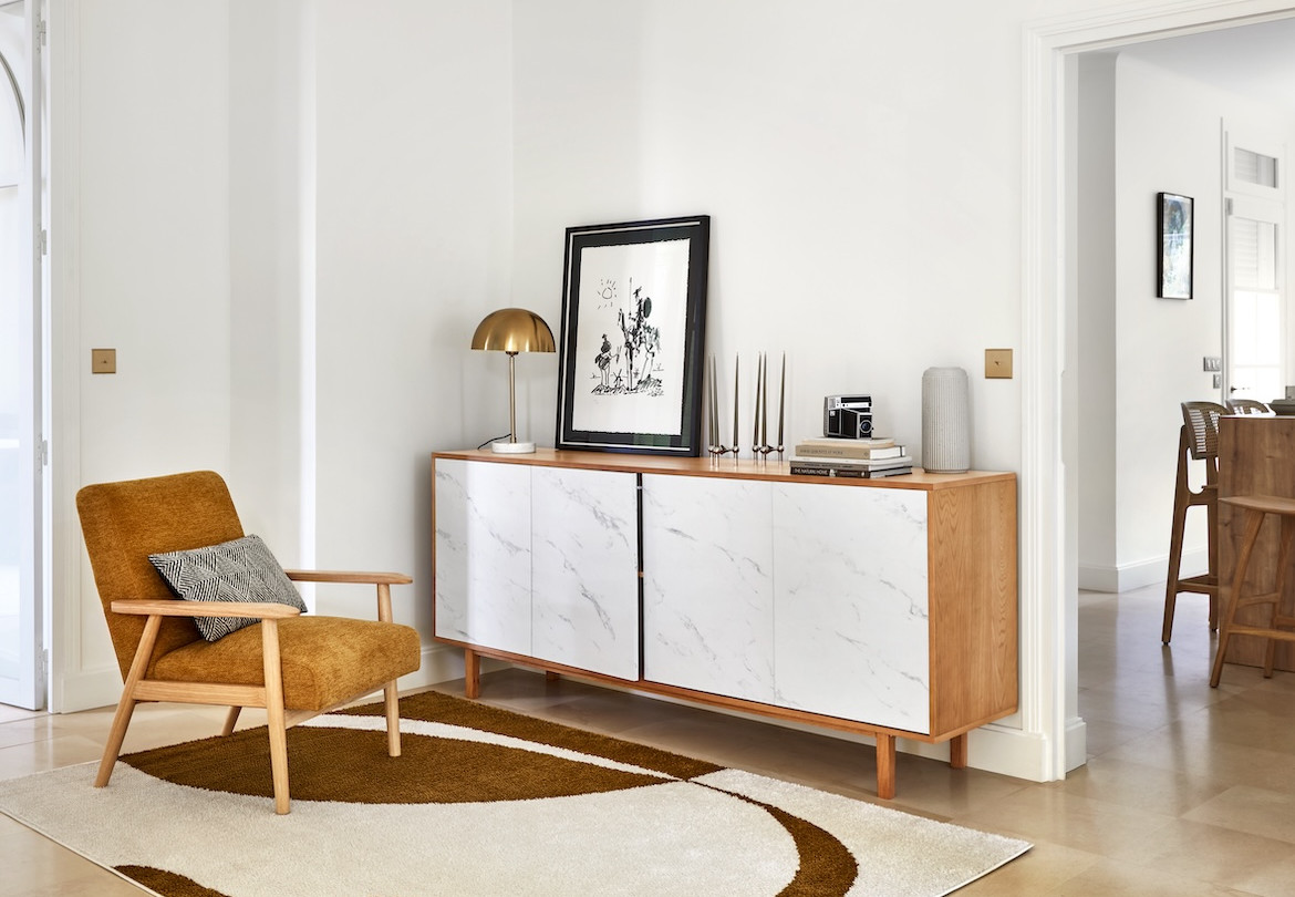 C’est sans doute la tendance la plusraffinée de la collection. Le mariage du marbre et du bois crée une harmonie à la fois naturelle et sophistiquée. Les veines délicates du marbre dialoguent avec la chaleur du bois blond, pour un rendu à la fois lumineux et apaisant. Le canapé d’angle Univers trouve ici toute sa place, accompagné du buffet Mado et de la table de séjour Auxane, parfaits exemples de cette alliance réussie. Le tapis Miranda vient parfaire l’ensemble, dans une palette neutre qui souligne la pureté des lignes.